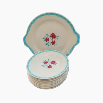 Bel état, sauf une assiette jaunie, tachée faïencée.
